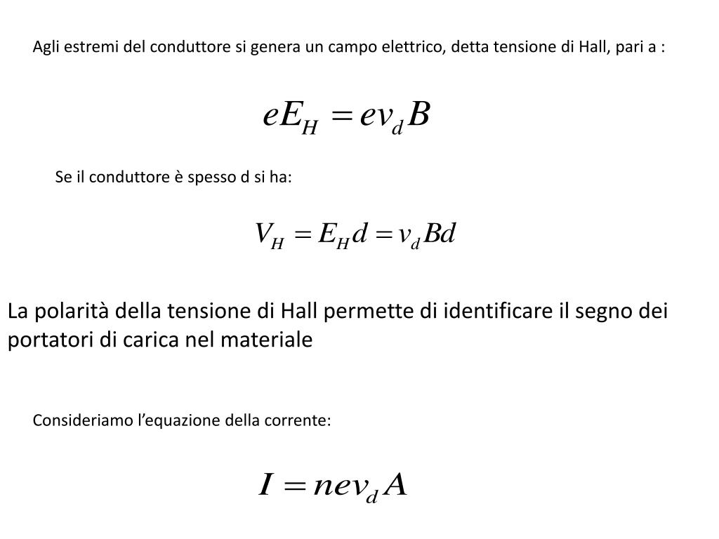 Agli estremi del conduttore si genera un campo elettrico, detta tensione di Hall, pari a : Se il conduttore è spesso d si ha: La polarità della tensione di Hall permette di identificare il segno dei portatori di carica nel materiale Consideriamo l’equazione della corrente: