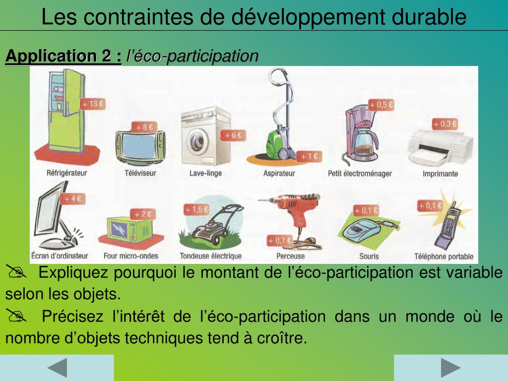 Les contraintes de développement durable Application 2 : l’éco-participation Expliquez pourquoi le montant de l’éco-participation est variable selon les objets. Précisez l’intérêt de l’éco-participation dans un monde où le nombre d’objets techniques tend à croître.