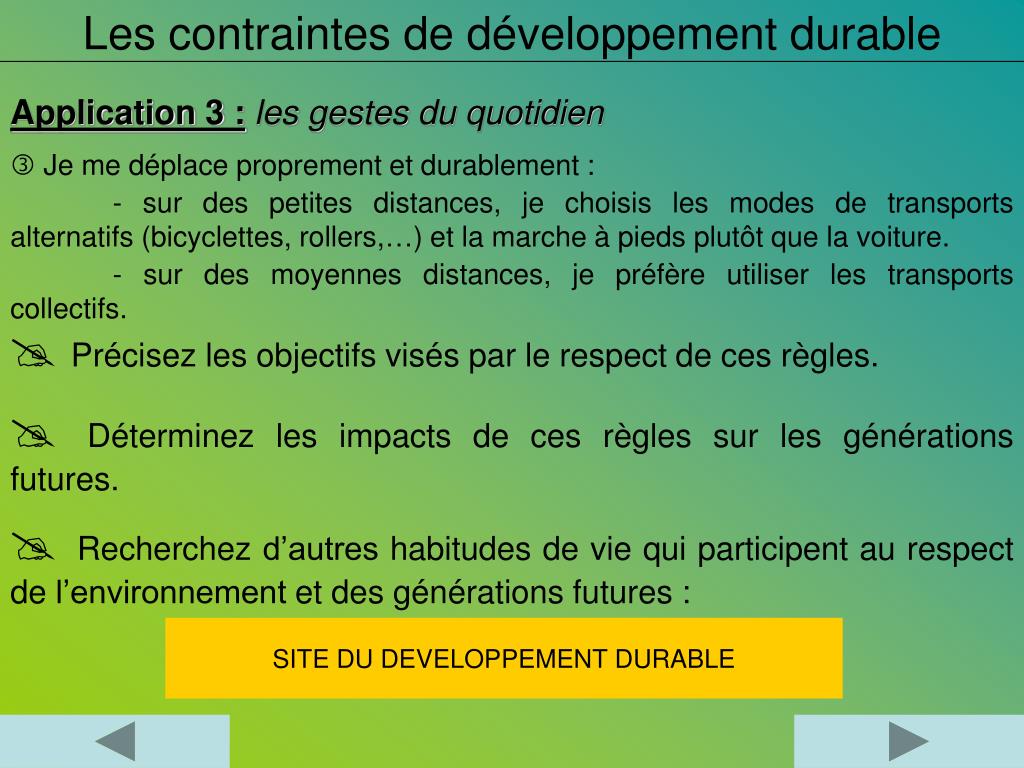 Les contraintes de développement durable Application 3 : les gestes du quotidien Je me déplace proprement et durablement : - sur des petites distances, je choisis les modes de transports alternatifs (bicyclettes, rollers,…) et la marche à pieds plutôt que la voiture. - sur des moyennes distances, je préfère utiliser les transports collectifs. Précisez les objectifs visés par le respect de ces règles. Déterminez les impacts de ces règles sur les générations futures. Recherchez d’autres habitudes de vie qui participent au respect de l’environnement et des générations futures : SITE DU DEVELOPPEMENT DURABLE