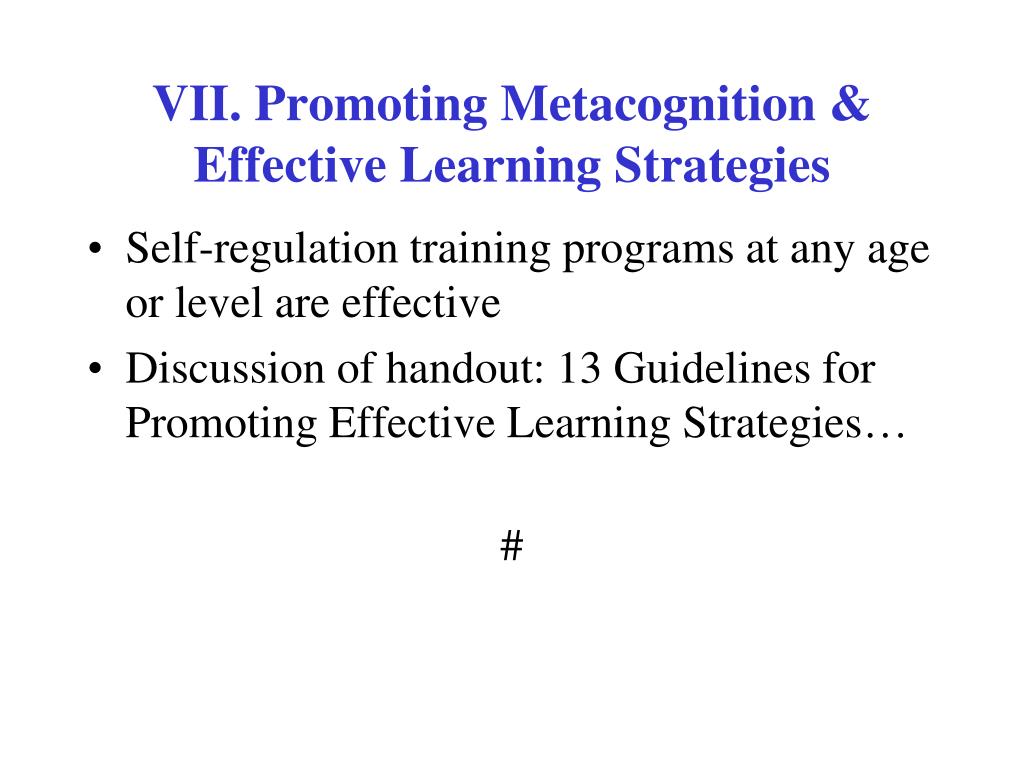 VII. Promoting Metacognition & Effective Learning Strategies • Self-regulation training programs at any age or level are effective • Discussion of handout: 13 Guidelines for Promoting Effective Learning Strategies… #