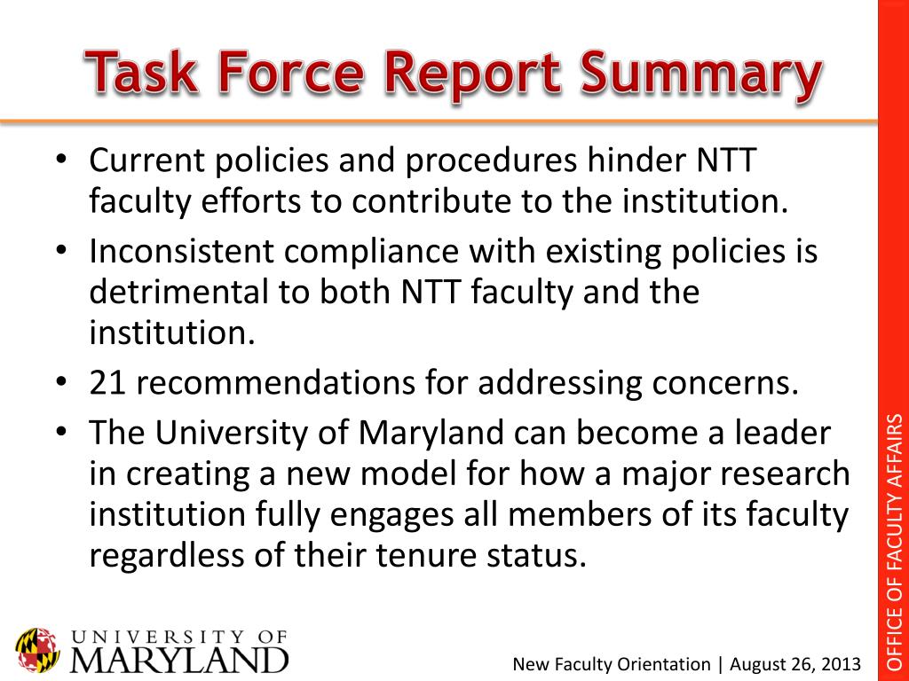 Task Force Report Summary OFFICE OF FACULTY AFFAIRS Current policies and procedures hinder NTT faculty efforts to contribute to the institution. Inconsistent compliance with existing policies is detrimental to both NTT faculty and the institution. 21 recommendations for addressing concerns. The University of Maryland can become a leader in creating a new model for how a major research institution fully engages all members of its faculty regardless of their tenure status.