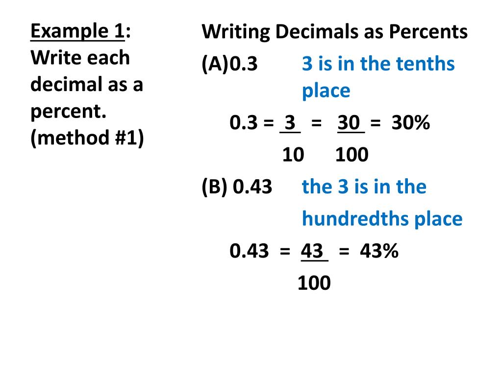 Example 1:Write each decimal as a percent.(method #1) Writing Decimals as Percents • 0.3 3 is in the tenths place 0.3 = 3 = 30 = 30% 10 100 (B) 0.43 the 3 is in the hundredths place 0.43 = 43 = 43% 100