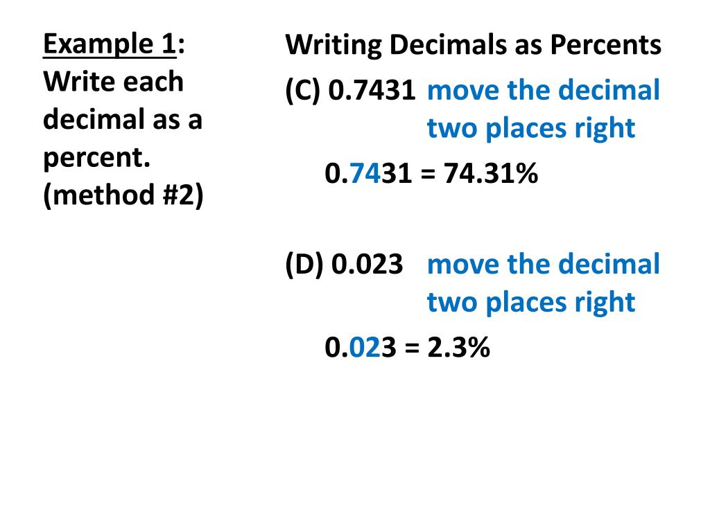 Example 1:Write each decimal as a percent.(method #2) Writing Decimals as Percents (C) 0.7431 move the decimal two places right 0.7431 = 74.31% (D) 0.023 move the decimal two places right 0.023 = 2.3%