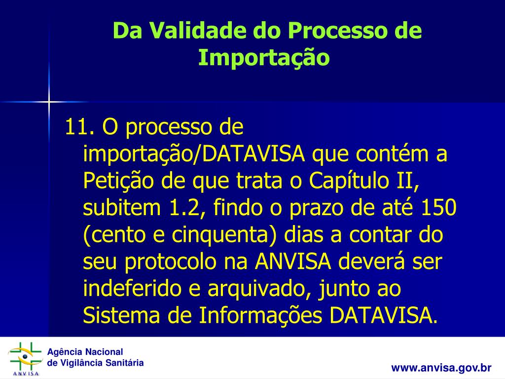 Da Validade do Processo de Importação 11. O processo de importação/DATAVISA que contém a Petição de que trata o Capítulo II, subitem 1.2, findo o prazo de até 150 (cento e cinquenta) dias a contar do seu protocolo na ANVISA deverá ser indeferido e arquivado, junto ao Sistema de Informações DATAVISA.
