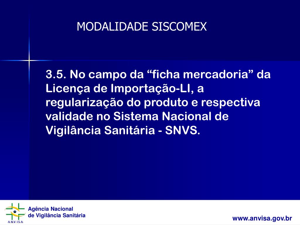 MODALIDADE SISCOMEX 3.5. No campo da “ficha mercadoria” da Licença de Importação-LI, a regularização do produto e respectiva validade no Sistema Nacional de Vigilância Sanitária - SNVS.