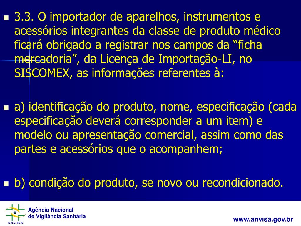 3.3. O importador de aparelhos, instrumentos e acessórios integrantes da classe de produto médico ficará obrigado a registrar nos campos da “ficha mercadoria”, da Licença de Importação-LI, no SISCOMEX, as informações referentes à: a) identificação do produto, nome, especificação (cada especificação deverá corresponder a um item) e modelo ou apresentação comercial, assim como das partes e acessórios que o acompanhem; b) condição do produto, se novo ou recondicionado.