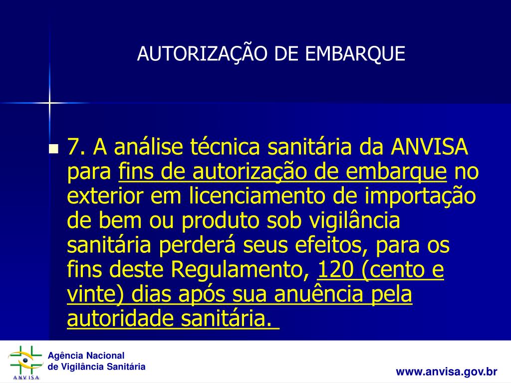 7. A análise técnica sanitária da ANVISA para fins de autorização de embarque no exterior em licenciamento de importação de bem ou produto sob vigilância sanitária perderá seus efeitos, para os fins deste Regulamento, 120 (cento e vinte) dias após sua anuência pela autoridade sanitária. AUTORIZAÇÃO DE EMBARQUE