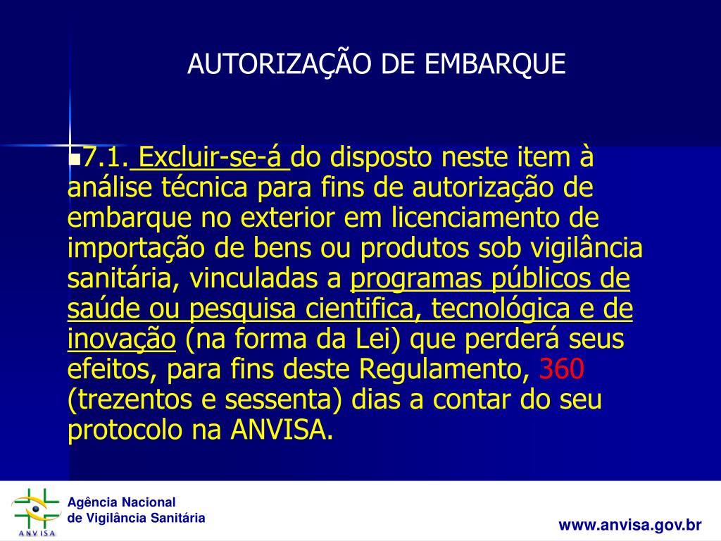 7.1. Excluir-se-á do disposto neste item à análise técnica para fins de autorização de embarque no exterior em licenciamento de importação de bens ou produtos sob vigilância sanitária, vinculadas a programas públicos de saúde ou pesquisa cientifica, tecnológica e de inovação (na forma da Lei) que perderá seus efeitos, para fins deste Regulamento, 360 (trezentos e sessenta) dias a contar do seu protocolo na ANVISA. AUTORIZAÇÃO DE EMBARQUE