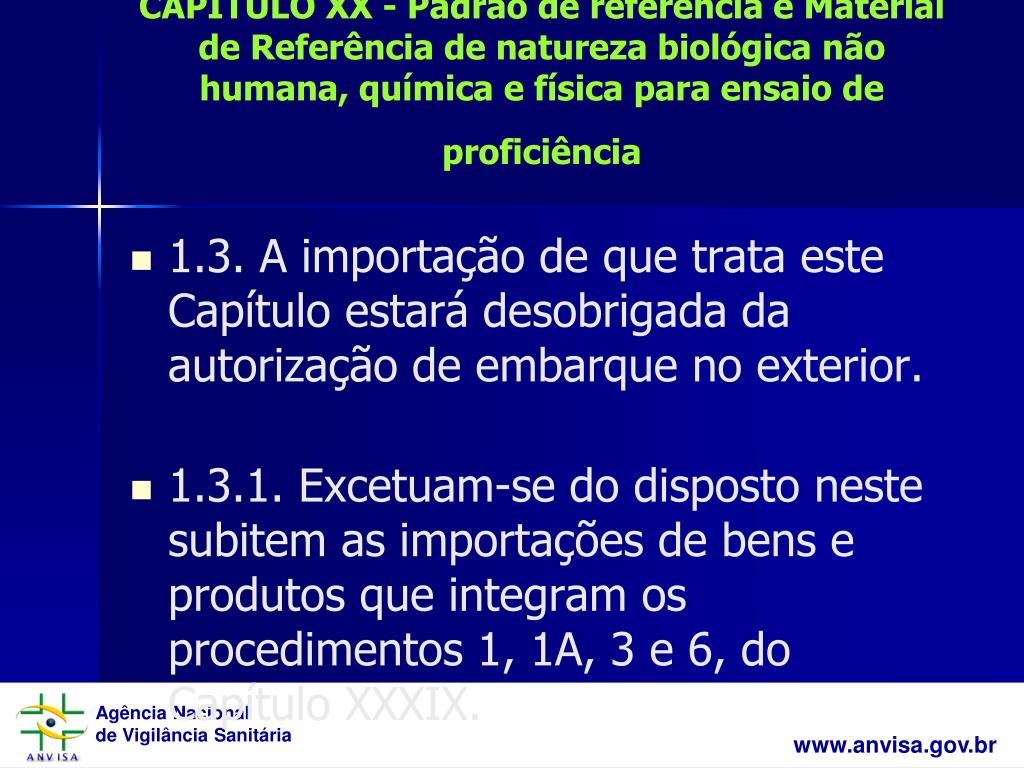 CAPÍTULO XX - Padrão de referência e Material de Referência de natureza biológica não humana, química e física para ensaio de proficiência • 1.3. A importação de que trata este Capítulo estará desobrigada da autorização de embarque no exterior. • 1.3.1. Excetuam-se do disposto neste subitem as importações de bens e produtos que integram os procedimentos 1, 1A, 3 e 6, do Capítulo XXXIX.