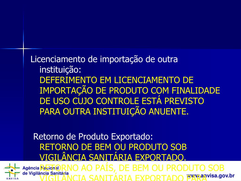 Licenciamento de importação de outra instituição:DEFERIMENTO EM LICENCIAMENTO DE IMPORTAÇÃO DE PRODUTO COM FINALIDADE DE USO CUJO CONTROLE ESTÁ PREVISTO PARA OUTRA INSTITUIÇÃO ANUENTE. Retorno de Produto Exportado: RETORNO DE BEM OU PRODUTO SOB VIGILÂNCIA SANITÁRIA EXPORTADO. RETORNO AO PAÍS, DE BEM OU PRODUTO SOB VIGILÂNCIA SANITÁRIA EXPORTADO PARA REPAROS, CONSERTOS OU RESTAURAÇÃO NO EXTERIOR.