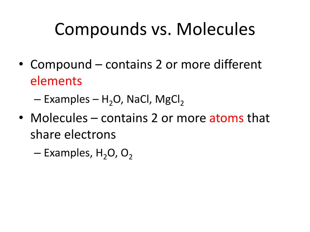 Compounds vs. Molecules • Compound – contains 2 or more different elements • Examples – H2O, NaCl, MgCl2 • Molecules – contains 2 or more atoms that share electrons • Examples, H2O, O2
