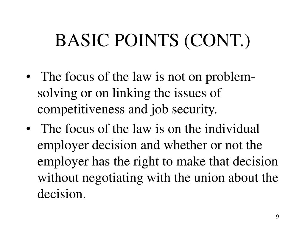 BASIC POINTS (CONT.) • The focus of the law is not on problem-solving or on linking the issues of competitiveness and job security. • The focus of the law is on the individual employer decision and whether or not the employer has the right to make that decision without negotiating with the union about the decision.