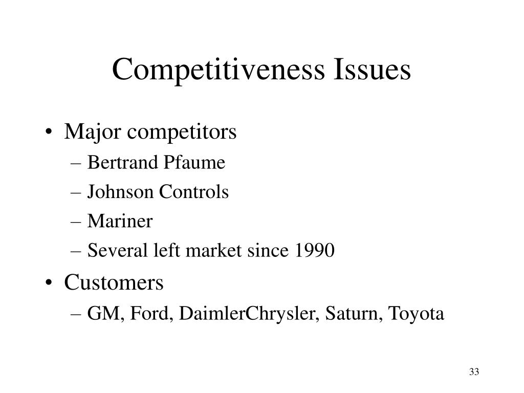 Competitiveness Issues • Major competitors • Bertrand Pfaume • Johnson Controls • Mariner • Several left market since 1990 • Customers • GM, Ford, DaimlerChrysler, Saturn, Toyota