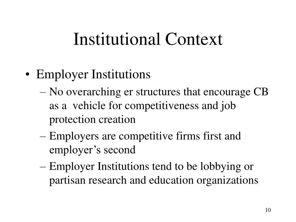 Institutional Context • Employer Institutions • No overarching er structures that encourage CB as a vehicle for competitiveness and job protection creation • Employers are competitive firms first and employer’s second • Employer Institutions tend to be lobbying or partisan research and education organizations