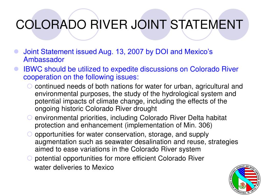 COLORADO RIVER JOINT STATEMENT • Joint Statement issued Aug. 13, 2007 by DOI and Mexico’s Ambassador • IBWC should be utilized to expedite discussions on Colorado River cooperation on the following issues: • continued needs of both nations for water for urban, agricultural and environmental purposes, the study of the hydrological system and potential impacts of climate change, including the effects of the ongoing historic Colorado River drought • environmental priorities, including Colorado River Delta habitat protection and enhancement (implementation of Min. 306) • opportunities for water conservation, storage, and supply augmentation such as seawater desalination and reuse, strategies aimed to ease variations in the Colorado River system • potential opportunities for more efficient Colorado River water deliveries to Mexico
