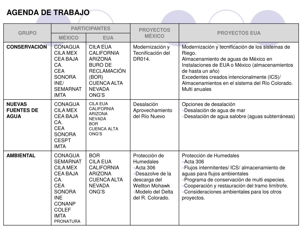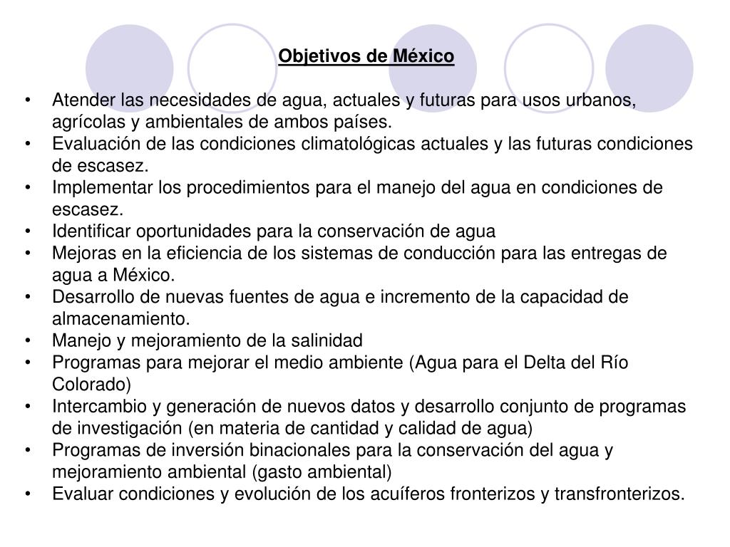 Objetivos de México • Atender las necesidades de agua, actuales y futuras para usos urbanos, agrícolas y ambientales de ambos países. • Evaluación de las condiciones climatológicas actuales y las futuras condiciones de escasez. • Implementar los procedimientos para el manejo del agua en condiciones de escasez. • Identificar oportunidades para la conservación de agua • Mejoras en la eficiencia de los sistemas de conducción para las entregas de agua a México. • Desarrollo de nuevas fuentes de agua e incremento de la capacidad de almacenamiento. • Manejo y mejoramiento de la salinidad • Programas para mejorar el medio ambiente (Agua para el Delta del Río Colorado) • Intercambio y generación de nuevos datos y desarrollo conjunto de programas de investigación (en materia de cantidad y calidad de agua) • Programas de inversión binacionales para la conservación del agua y mejoramiento ambiental (gasto ambiental) • Evaluar condiciones y evolución de los acuíferos fronterizos y transfronterizos.