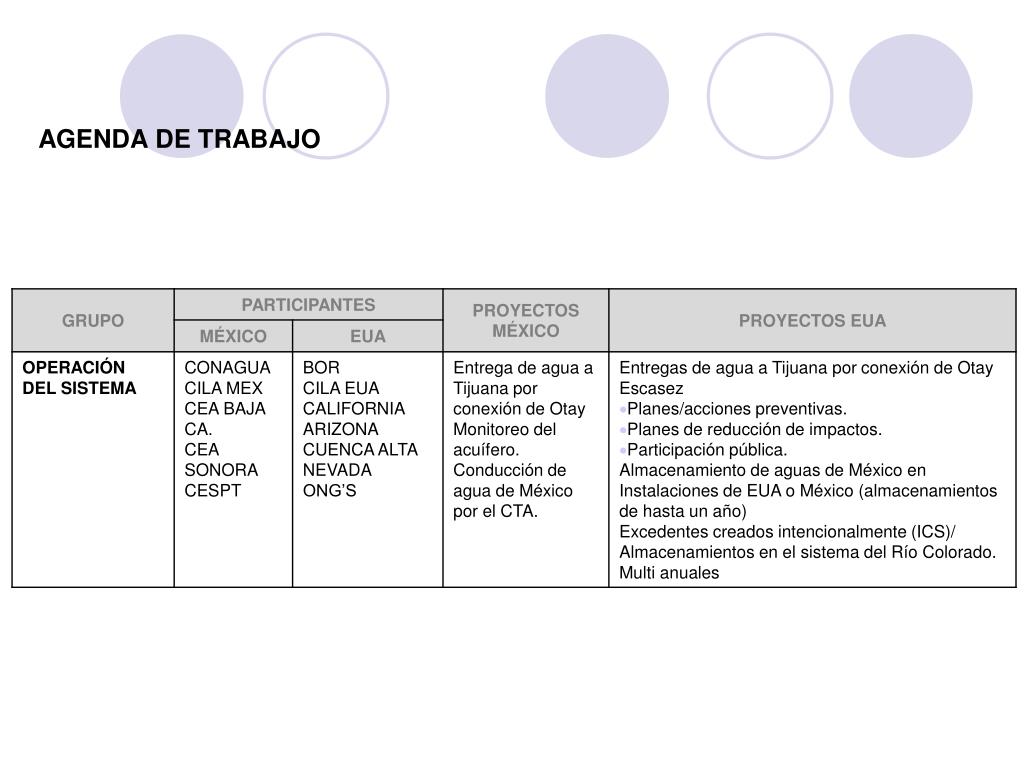 ANTECEDENTES • COMUNICADO CONJUNTO • El 13 de agosto de 2007 México y EUA emitieron un comunicado conjunto en el que acuerdan discutir acciones de cooperación conjunta relacionadas con el Río Colorado. • Se acordó que las discusiones se realizarían en el marco de la CILA y se abordarían los siguientes aspectos: • Las continuas necesidades de agua de ambas naciones para uso urbano, agricultura y del medio ambiente. El estudio del sistema hidrológico y los impactos potenciales derivados del cambio climático, incluida la continua e histórica sequía en el Río Colorado. • Las prioridades ambientales, incluyendo la protección y el mejoramiento del hábitat del Delta del Río Colorado • Oportunidades para la conservación de agua, incremento en el agua y en el suministro, mediante acciones como desalación de agua marina y su reutilización, estrategias diseñadas para disminuir los impactos de las variaciones del sistema hídrico del R. Colorado. • Las oportunidades potenciales para una mejor y eficaz entrega del agua del R. Colorado a México