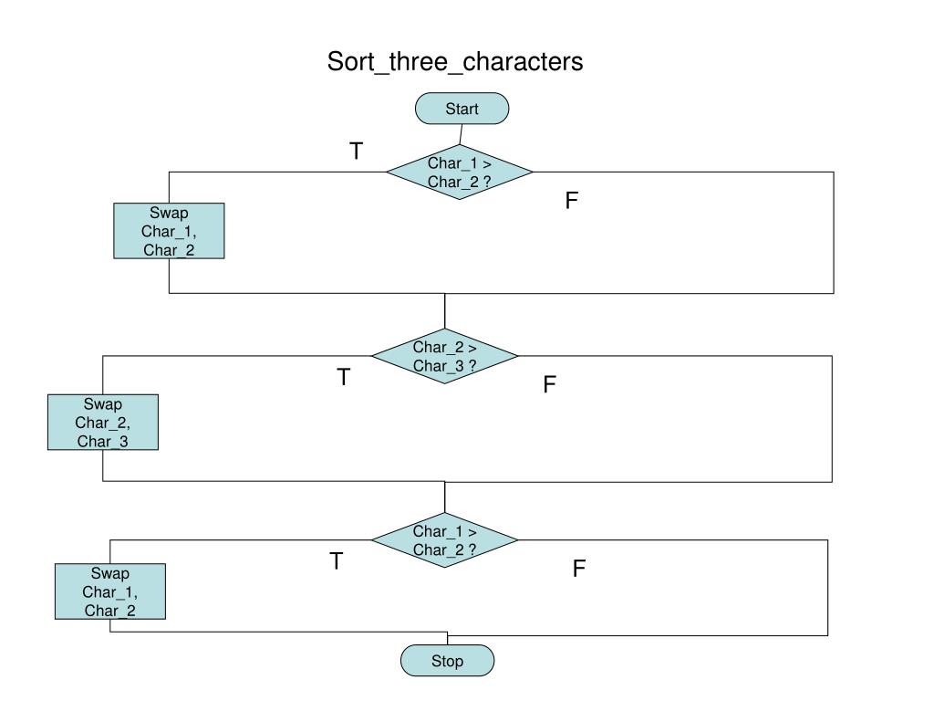 Sort_three_characters Start T Char_1 > Char_2 ? F Swap Char_1, Char_2 Char_2 > Char_3 ? T F Swap Char_2, Char_3 Char_1 > Char_2 ? T F Swap Char_1, Char_2 Stop