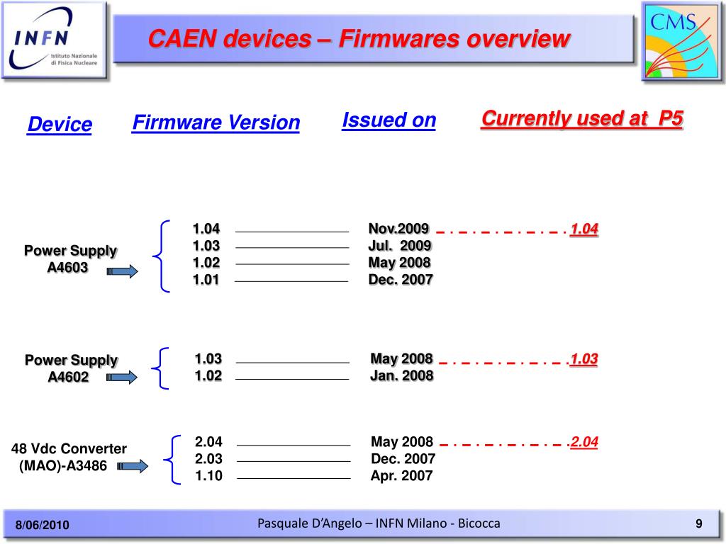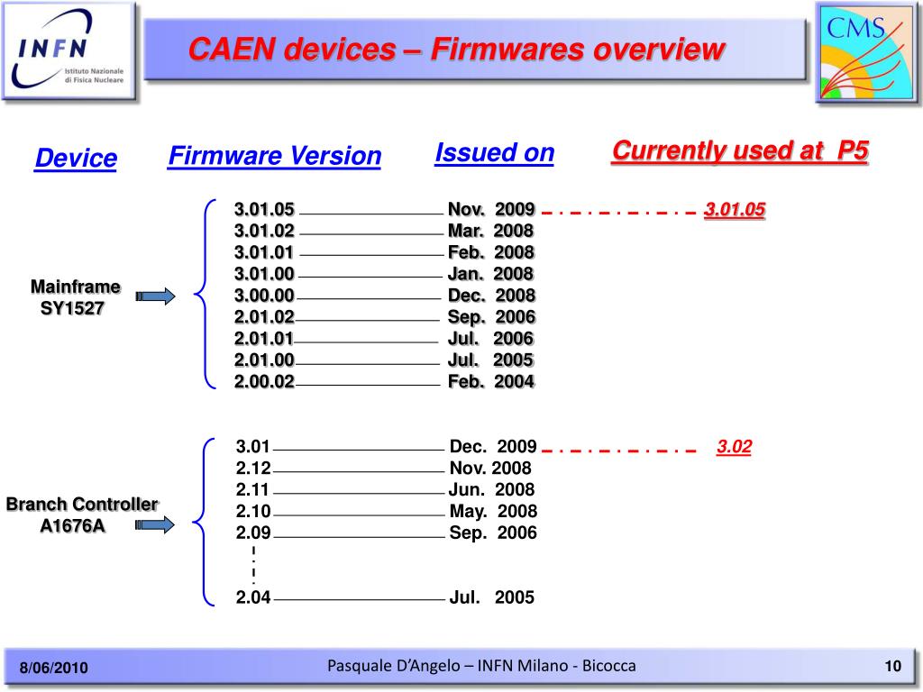 CAEN devices – Firmwares overview Currently used at P5 Issued on Firmware Version Device 1.04 Nov.2009 1.04 1.03 Jul. 2009 1.02 May 2008 1.01 Dec. 2007 Power Supply A4603 1.03 May 2008 1.03 1.02 Jan. 2008 Power Supply A4602 2.04 May 2008 2.04 2.03 Dec. 2007 1.10 Apr. 2007 48 Vdc Converter (MAO)-A3486 Pasquale D’Angelo – INFN Milano - Bicocca 9 8/06/2010
