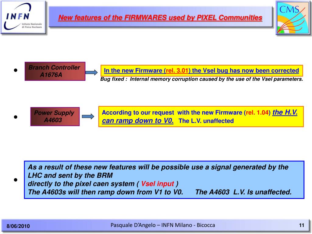 CAEN devices – Firmwares overview Currently used at P5 Issued on Firmware Version Device 3.01.05 Nov. 2009 3.01.05 3.01.02 Mar. 2008 3.01.01 Feb. 2008 3.01.00 Jan. 2008 3.00.00 Dec. 2008 2.01.02 Sep. 2006 2.01.01 Jul. 2006 2.01.00 Jul. 2005 2.00.02 Feb. 2004 Mainframe SY1527 3.01 Dec. 2009 3.02 2.12 Nov. 2008 2.11 Jun. 2008 2.10 May. 2008 2.09 Sep. 2006 2.04 Jul. 2005 Branch Controller A1676A Pasquale D’Angelo – INFN Milano - Bicocca 10 8/06/2010