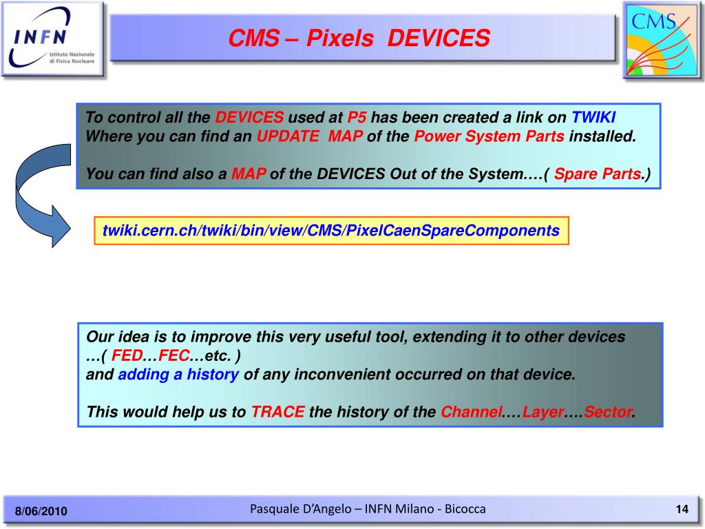 CMS – Pixels DEVICES To control all the DEVICES used at P5 has been created a link on TWIKI Where you can find an UPDATE MAP of the Power System Parts installed. You can find also a MAP of the DEVICES Out of the System.…( Spare Parts.) twiki.cern.ch/twiki/bin/view/CMS/PixelCaenSpareComponents Our idea is to improve this very useful tool, extending it to other devices …( FED…FEC…etc. ) and adding a history of any inconvenient occurred on that device. This would help us to TRACE the history of the Channel.…Layer….Sector. Pasquale D’Angelo – INFN Milano - Bicocca 14 8/06/2010