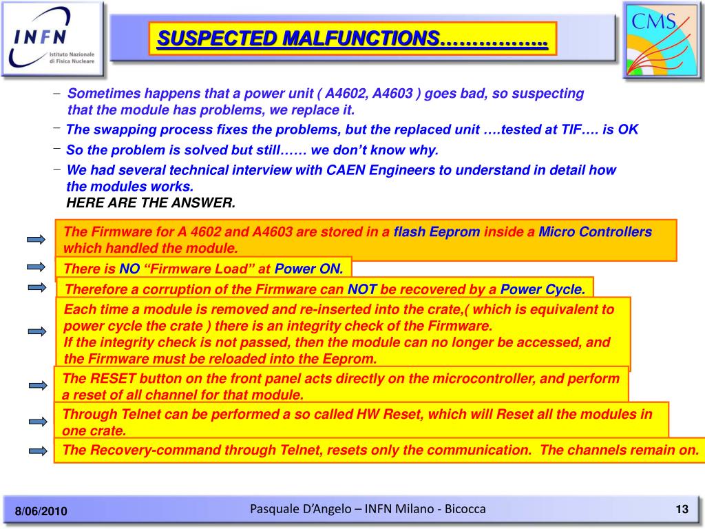 SUSPECTED MALFUNCTIONS…………….. _ Sometimes happens that a power unit ( A4602, A4603 ) goes bad, so suspecting that the module has problems, we replace it. _ The swapping process fixes the problems, but the replaced unit ….tested at TIF…. is OK _ So the problem is solved but still…… we don’t know why. _ We had several technical interview with CAEN Engineers to understand in detail how the modules works. HERE ARE THE ANSWER. The Firmware for A 4602 and A4603 are stored in a flash Eeprom inside a Micro Controllers which handled the module. There is NO “Firmware Load” at Power ON. Therefore a corruption of the Firmware can NOT be recovered by a Power Cycle. Each time a module is removed and re-inserted into the crate,( which is equivalent to power cycle the crate ) there is an integrity check of the Firmware. If the integrity check is not passed, then the module can no longer be accessed, and the Firmware must be reloaded into the Eeprom. The RESET button on the front panel acts directly on the microcontroller, and perform a reset of all channel for that module. Through Telnet can be performed a so called HW Reset, which will Reset all the modules in one crate. The Recovery-command through Telnet, resets only the communication. The channels remain on. Pasquale D’Angelo – INFN Milano - Bicocca 13 8/06/2010