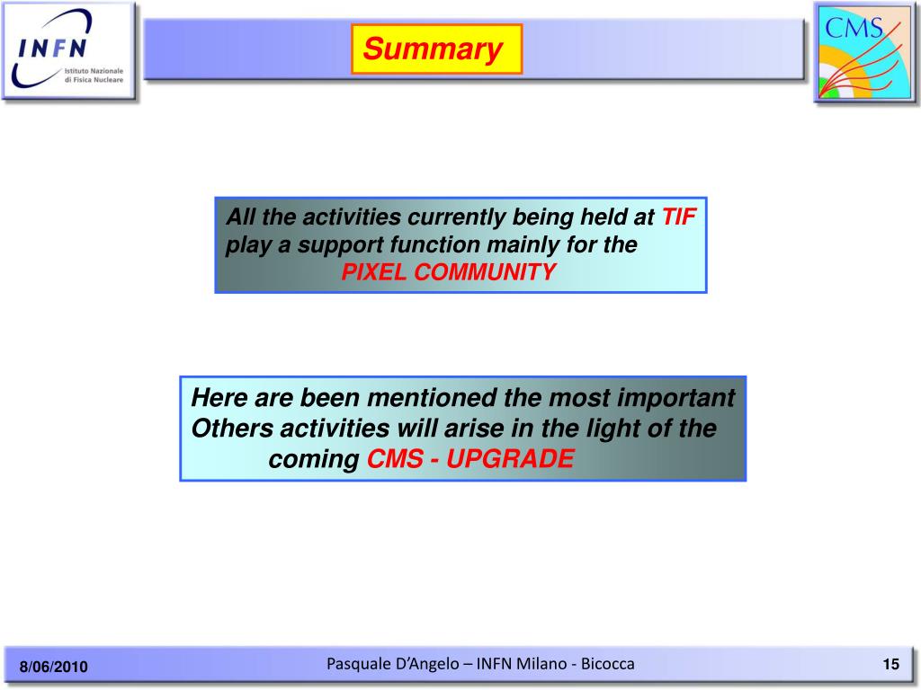 Summary All the activities currently being held at TIF play a support function mainly for the PIXEL COMMUNITY Here are been mentioned the most important Others activities will arise in the light of the coming CMS - UPGRADE Pasquale D’Angelo – INFN Milano - Bicocca 15 8/06/2010
