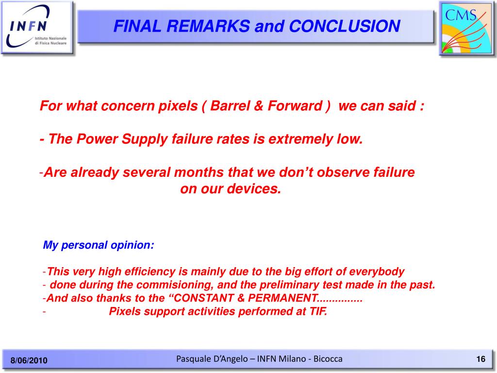 FINAL REMARKS and CONCLUSION • For what concern pixels ( Barrel & Forward ) we can said : • - The Power Supply failure rates is extremely low. • Are already several months that we don’t observe failure • on our devices. • My personal opinion: • This very high efficiency is mainly due to the big effort of everybody • done during the commisioning, and the preliminary test made in the past. • And also thanks to the “CONSTANT & PERMANENT............... • Pixels support activities performed at TIF. Pasquale D’Angelo – INFN Milano - Bicocca 16 8/06/2010