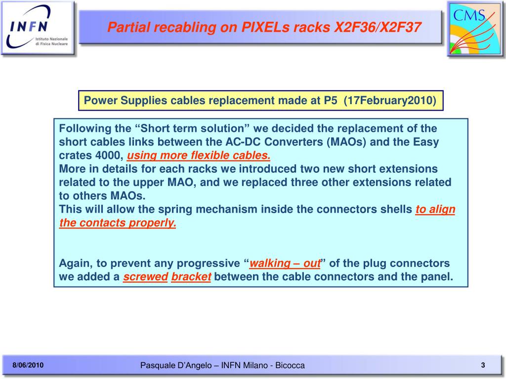 Partial recabling on PIXELs racks X2F36/X2F37 Power Supplies cables replacement made at P5 (17February2010) Following the “Short term solution” we decided the replacement of the short cables links between the AC-DC Converters (MAOs) and the Easy crates 4000, using more flexible cables. More in details for each racks we introduced two new short extensions related to the upper MAO, and we replaced three other extensions related to others MAOs. This will allow the spring mechanism inside the connectors shells to align the contacts properly. Again, to prevent any progressive “walking – out” of the plug connectors we added a screwedbracket between the cable connectors and the panel. Pasquale D’Angelo – INFN Milano - Bicocca 8/06/2010 3