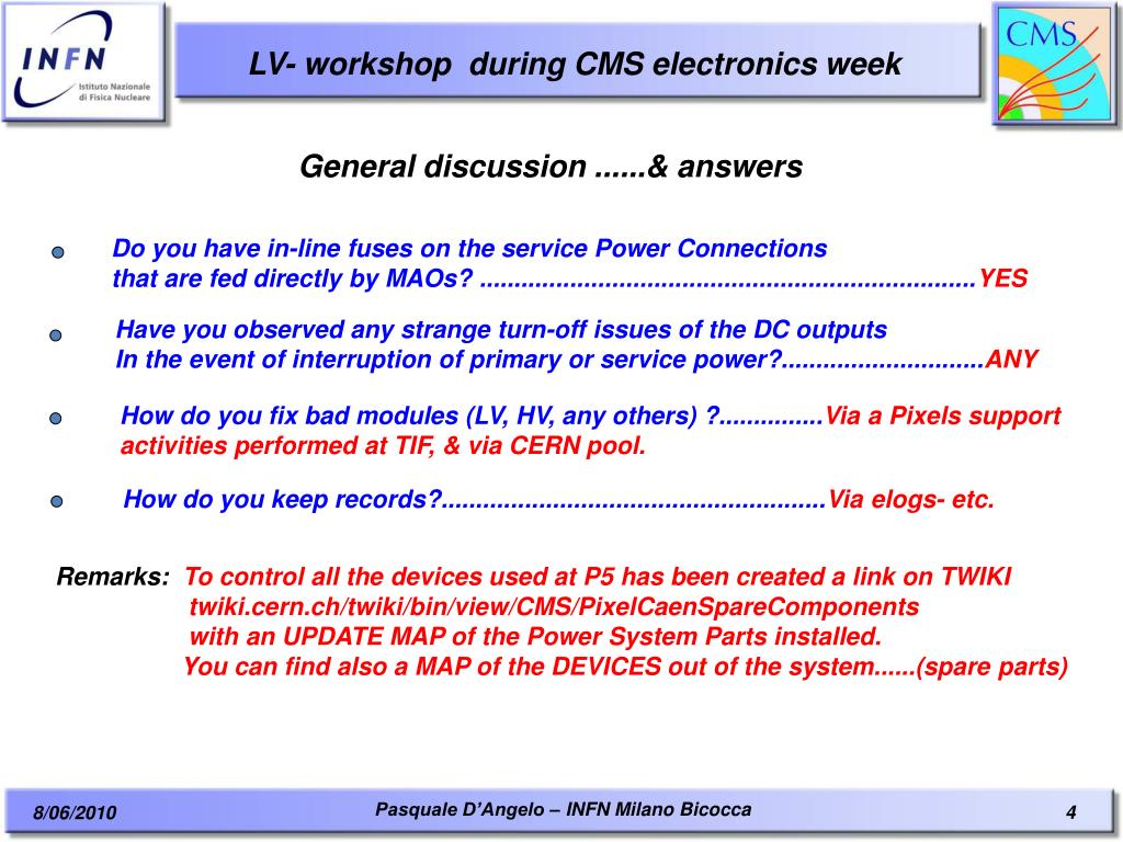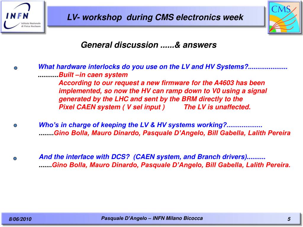 LV- workshop during CMS electronics week General discussion ......& answers Do you have in-line fuses on the service Power Connections that are fed directly by MAOs? .......................................................................YES Have you observed any strange turn-off issues of the DC outputs In the event of interruption of primary or service power?.............................ANY How do you fix bad modules (LV, HV, any others) ?...............Via a Pixels support activities performed at TIF, & via CERN pool. How do you keep records?.......................................................Via elogs- etc. Remarks: To control all the devices used at P5 has been created a link on TWIKI twiki.cern.ch/twiki/bin/view/CMS/PixelCaenSpareComponents with an UPDATE MAP of the Power System Parts installed. You can find also a MAP of the DEVICES out of the system......(spare parts) Pasquale D’Angelo – INFN Milano Bicocca 4 8/06/2010