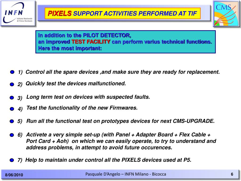 PIXELSSUPPORT ACTIVITIES PERFORMED AT TIF In addition to the PILOT DETECTOR, an improved TEST FACILITY can perform varius technical functions. Here the most important: Control all the spare devices ,and make sure they are ready for replacement. 1) Quickly test the devices malfunctioned. 2) Long term test on devices with suspected faults. 3) Test the functionality of the new Firmwares. 4) Run all the functional test on prototypes devices for next CMS-UPGRADE. 5) Activete a very simple set-up (with Panel + Adapter Board + Flex Cable + Port Card + Aoh) on which we can easily operate, to try to understand and address problems, in attempt to avoid future occurences. 6) Help to maintain under control all the PIXELS devices used at P5. 7) Pasquale D’Angelo – INFN Milano - Bicocca 6 8/06/2010