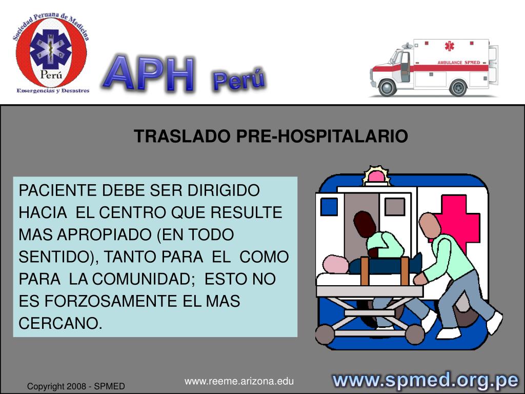 APHPerú TRASLADO PRE-HOSPITALARIO PACIENTE DEBE SER DIRIGIDO HACIA EL CENTRO QUE RESULTE MAS APROPIADO (EN TODO SENTIDO), TANTO PARA EL COMO PARA LA COMUNIDAD; ESTO NO ES FORZOSAMENTE EL MAS CERCANO. www.spmed.org.pe www.reeme.arizona.edu Copyright 2008 - SPMED