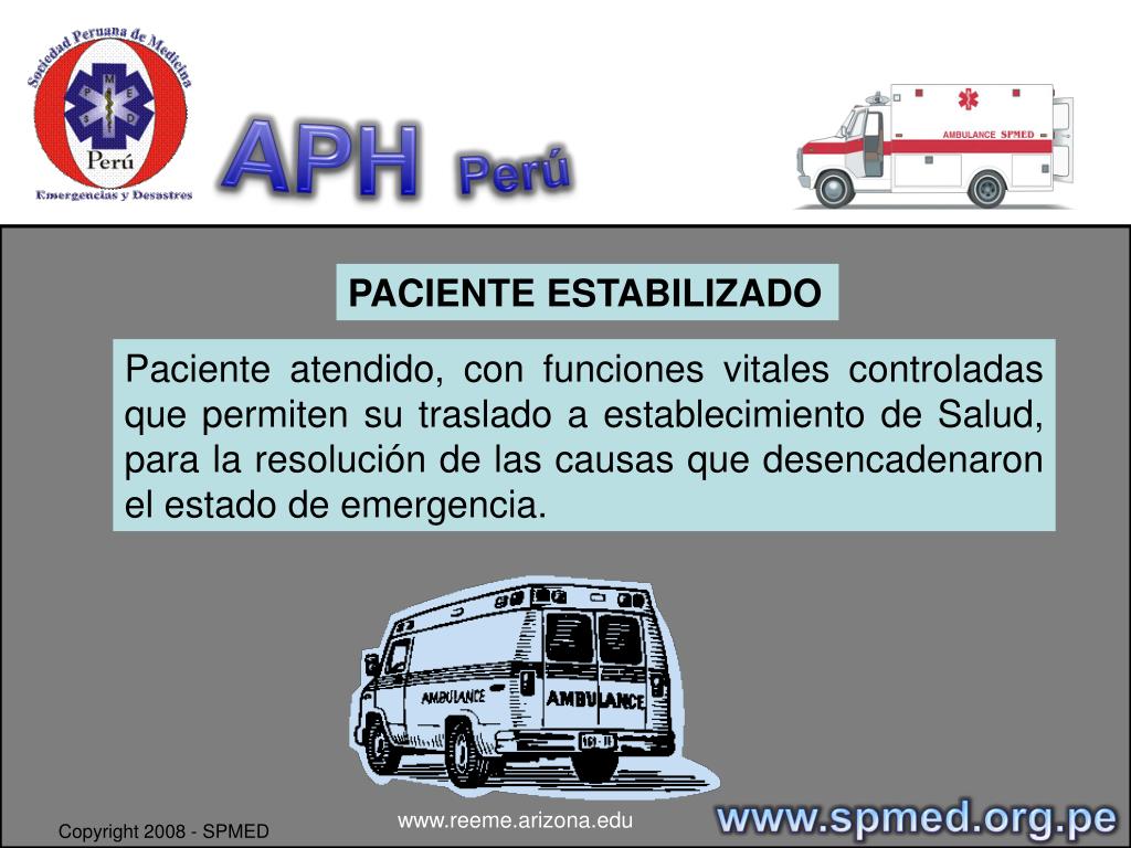 APHPerú PACIENTE ESTABILIZADO Paciente atendido, con funciones vitales controladas que permiten su traslado a establecimiento de Salud, para la resolución de las causas que desencadenaron el estado de emergencia. www.spmed.org.pe www.reeme.arizona.edu Copyright 2008 - SPMED