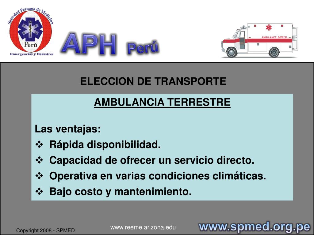 APHPerú TRANSPORTE ASISTIDO • La decisión de trasladar a un paciente al hospital se basa en una indicación médica y debe ser tomada por el médico que solicita la transferencia. • La ambulancia terrestre es la modalidad de transporte interinstitucional más usada y más económica. www.spmed.org.pe www.reeme.arizona.edu Copyright 2008 - SPMED