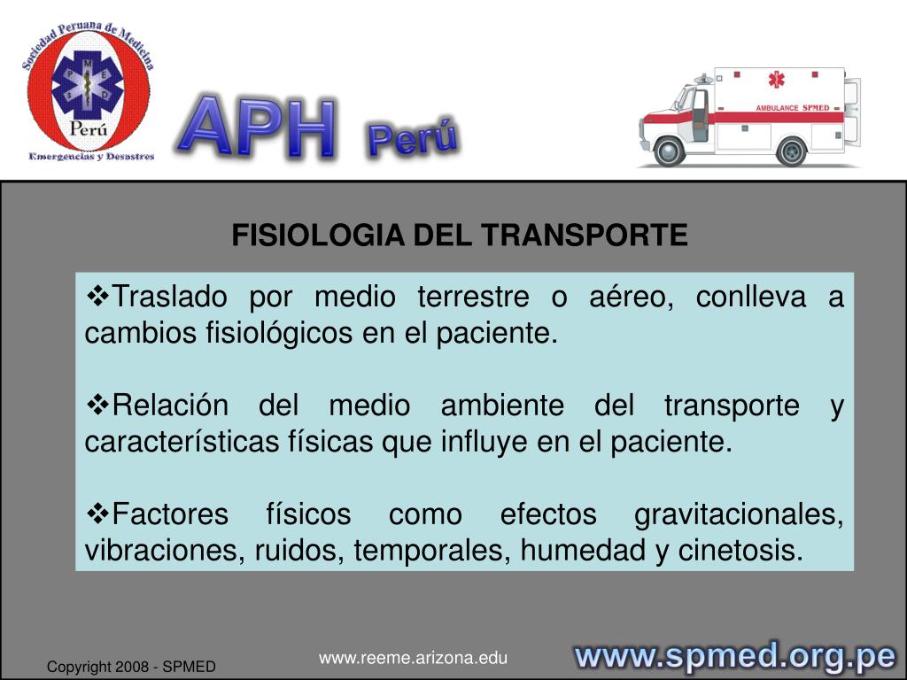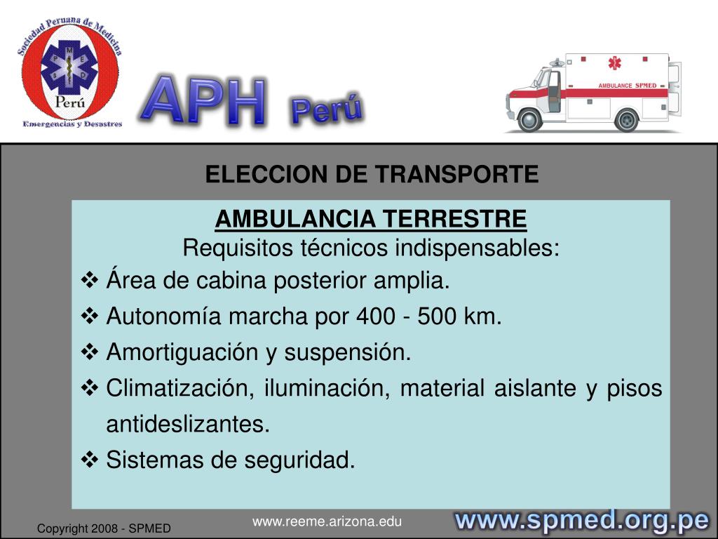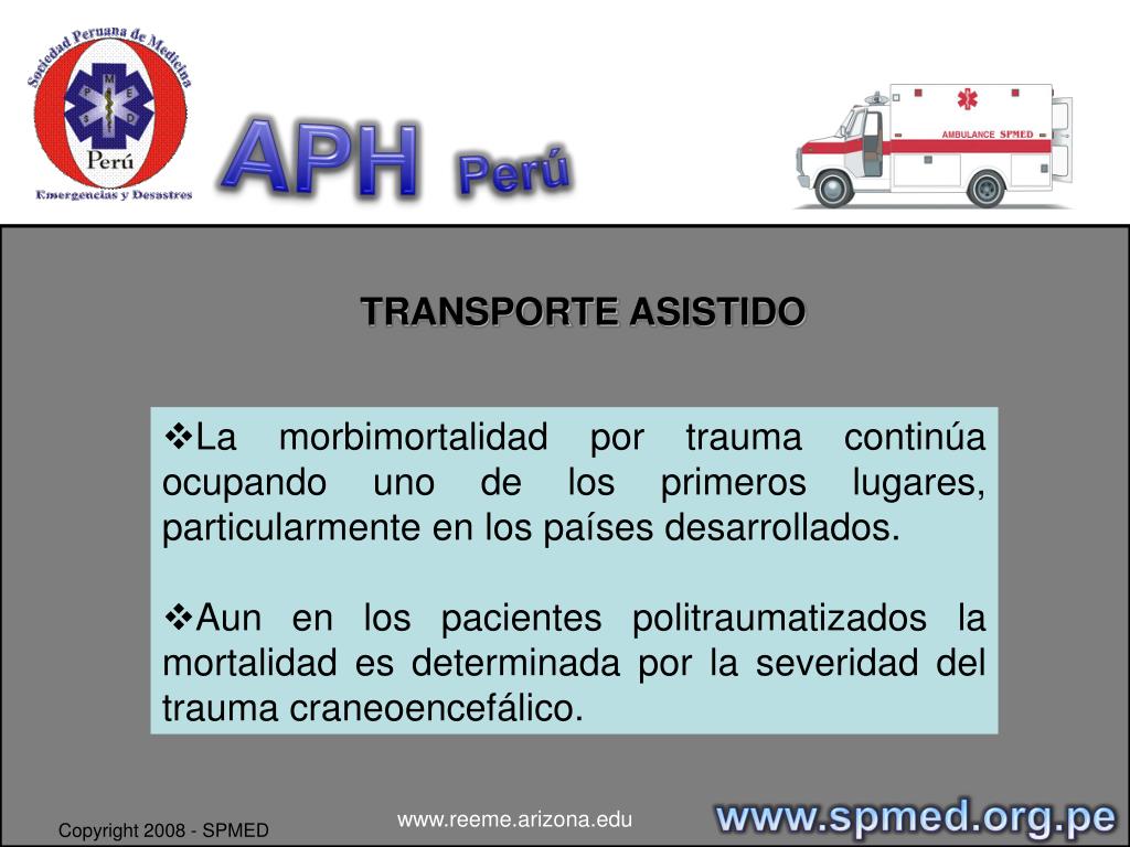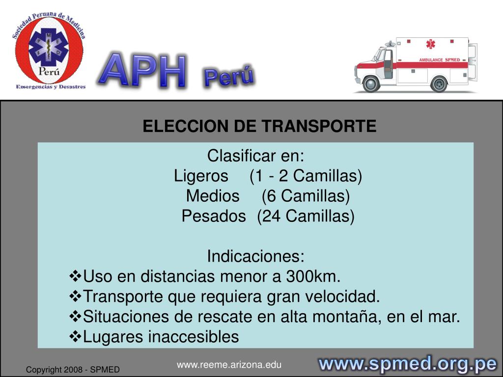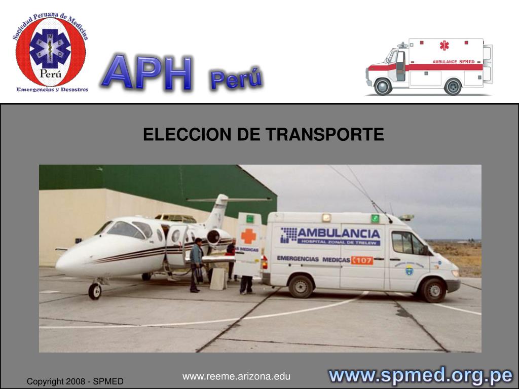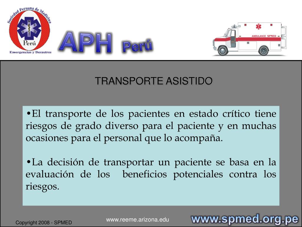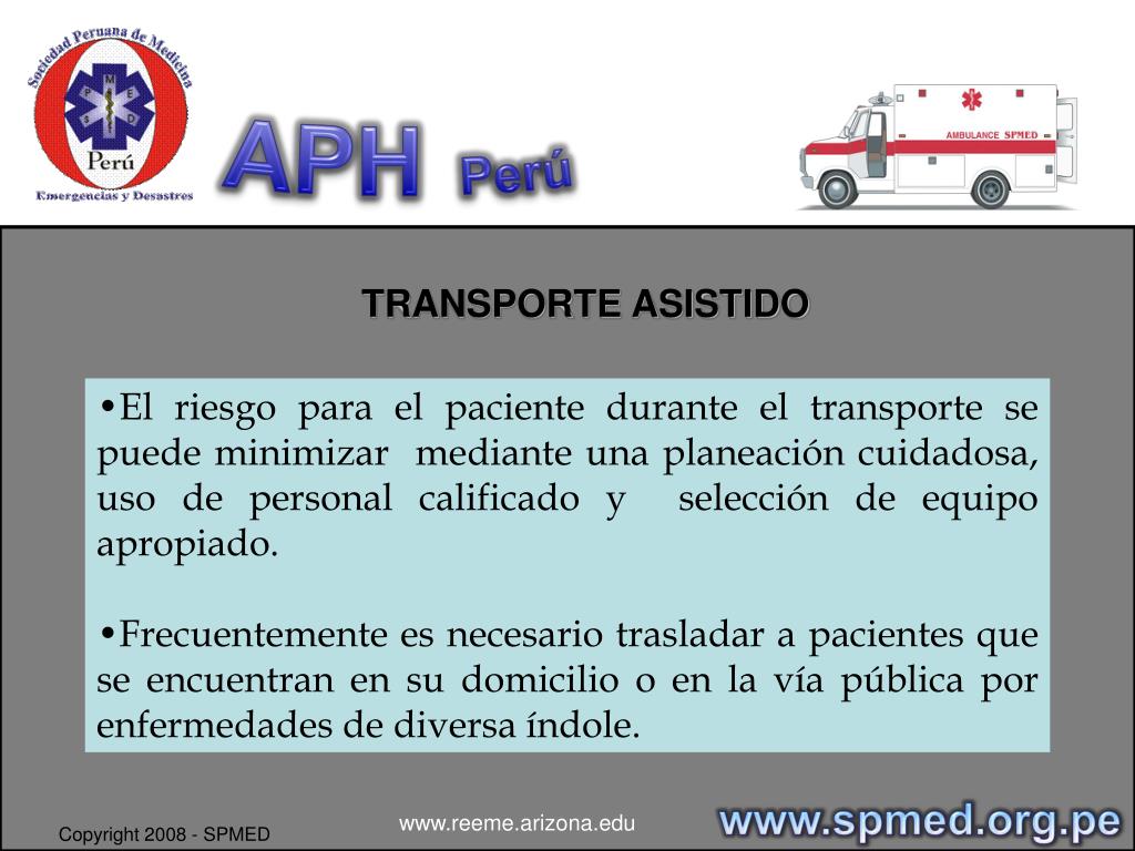 APHPerú TRANSPORTE ASISTIDO DE PACIENTE / NORMA TECNICA DR. SANDRO VALENCIA CALLE www.spmed.org.pe www.reeme.arizona.edu Copyright 2008 - SPMED