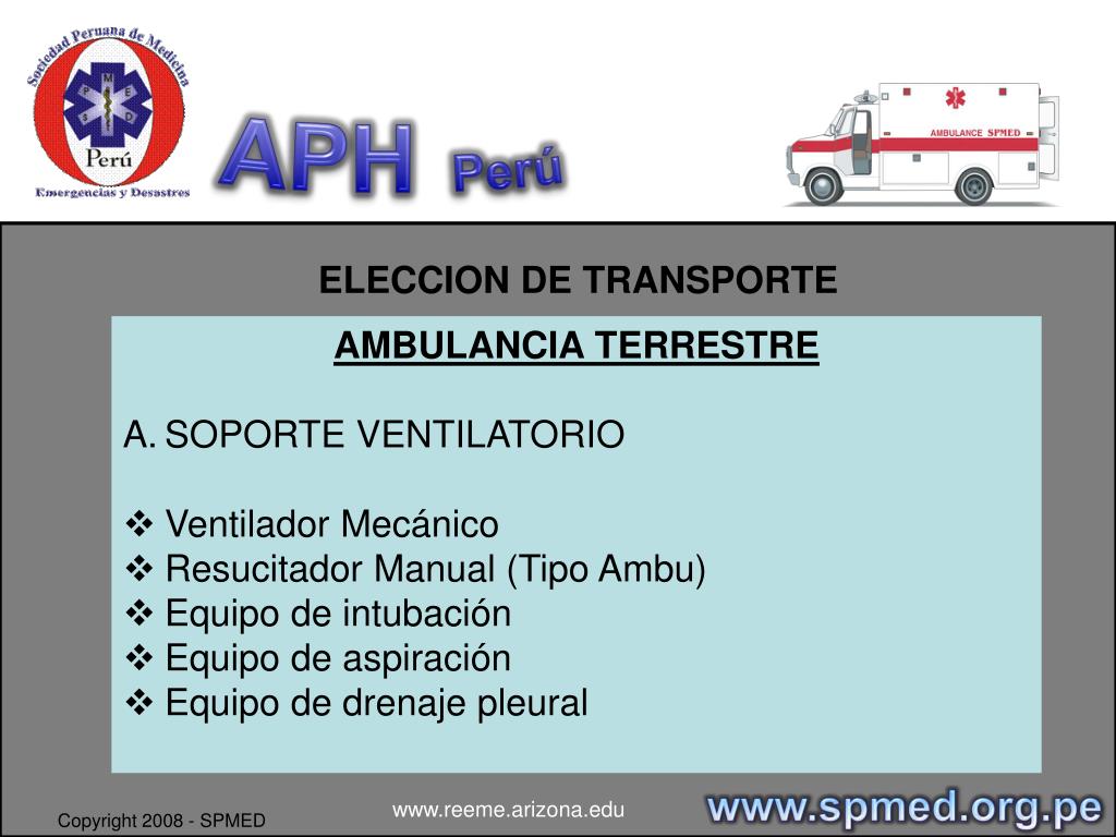 APHPerú ELECCION DE TRANSPORTE • AMBULANCIA TERRESTRE • SOPORTE VENTILATORIO • Ventilador Mecánico • Resucitador Manual (Tipo Ambu) • Equipo de intubación • Equipo de aspiración • Equipo de drenaje pleural www.spmed.org.pe www.reeme.arizona.edu Copyright 2008 - SPMED