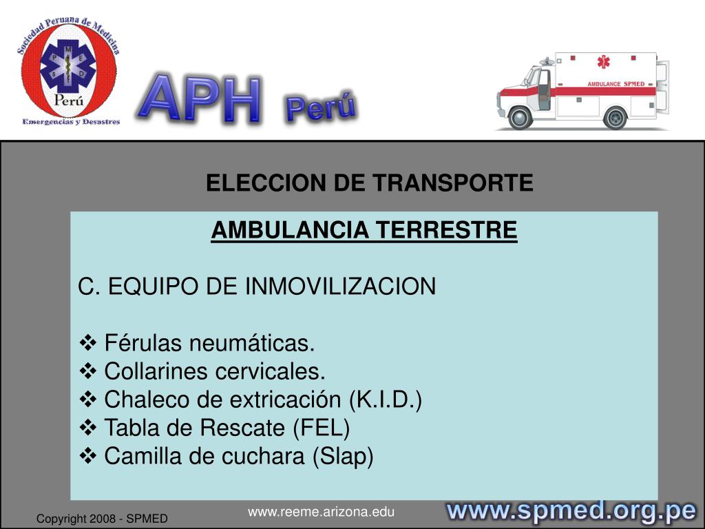 APHPerú ELECCION DE TRANSPORTE • AMBULANCIA TERRESTRE • C. EQUIPO DE INMOVILIZACION • Férulas neumáticas. • Collarines cervicales. • Chaleco de extricación (K.I.D.) • Tabla de Rescate (FEL) • Camilla de cuchara (Slap) www.spmed.org.pe www.reeme.arizona.edu Copyright 2008 - SPMED