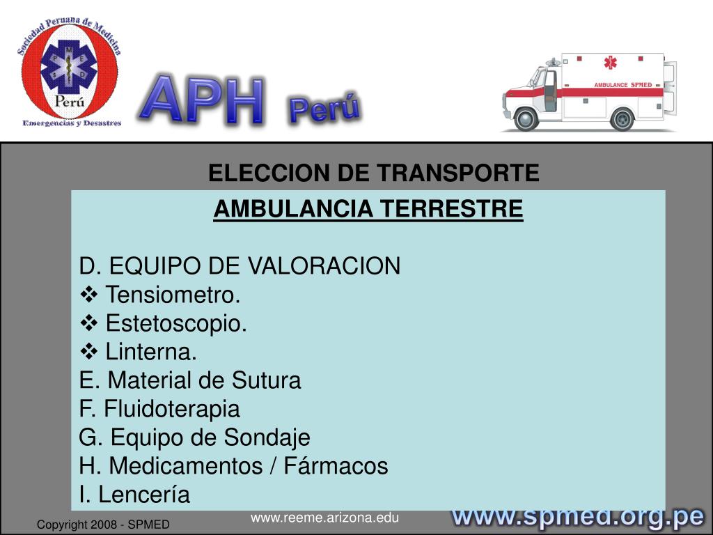APHPerú ELECCION DE TRANSPORTE • AMBULANCIA TERRESTRE • D. EQUIPO DE VALORACION • Tensiometro. • Estetoscopio. • Linterna. • E. Material de Sutura • F. Fluidoterapia • G. Equipo de Sondaje • H. Medicamentos / Fármacos • I. Lencería www.spmed.org.pe www.reeme.arizona.edu Copyright 2008 - SPMED