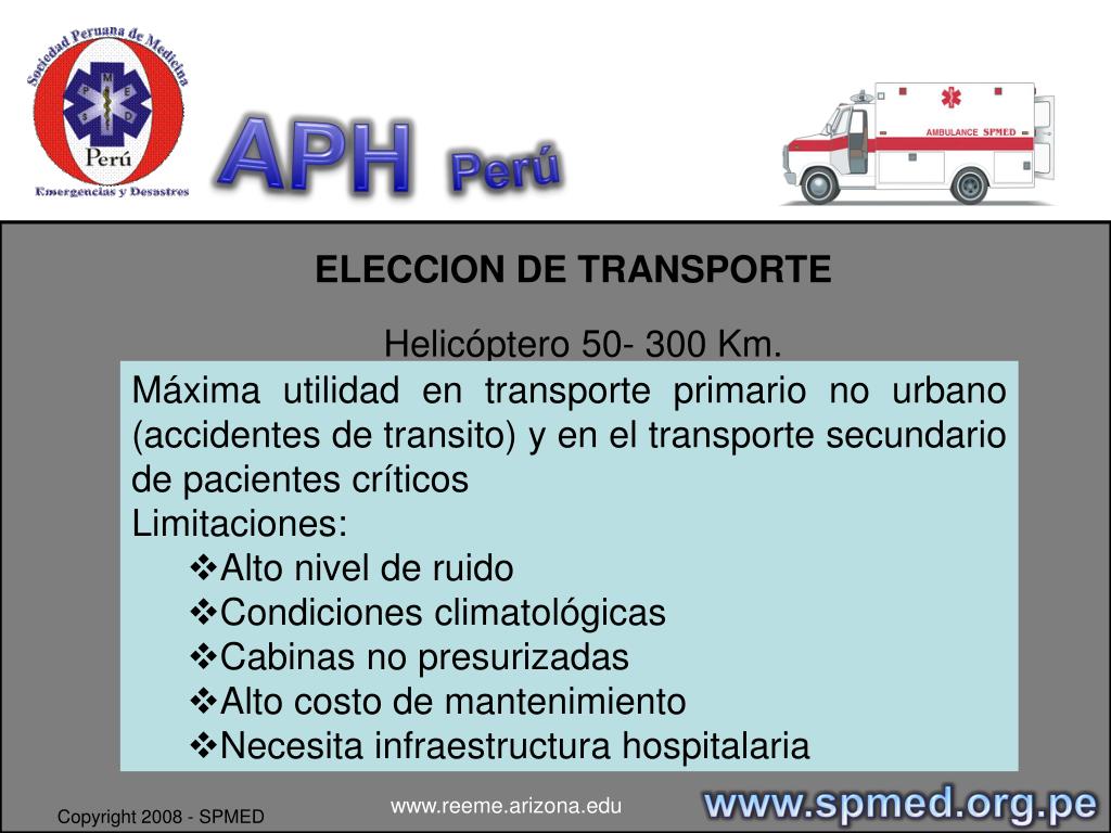 APHPerú ELECCION DE TRANSPORTE TRANSPORTE AEREO • Necesario un aeropuerto o helipuerto • Mayor velocidad. • Acorta las distancias y el tiempo de traslado. • Área limitada para transporte (Helicóptero). www.spmed.org.pe www.reeme.arizona.edu Copyright 2008 - SPMED