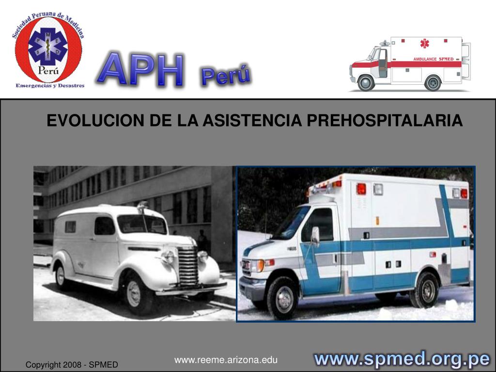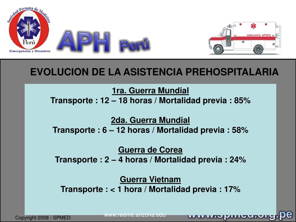 APHPerú EVOLUCION DE LA ASISTENCIA PREHOSPITALARIA www.spmed.org.pe www.reeme.arizona.edu Copyright 2008 - SPMED