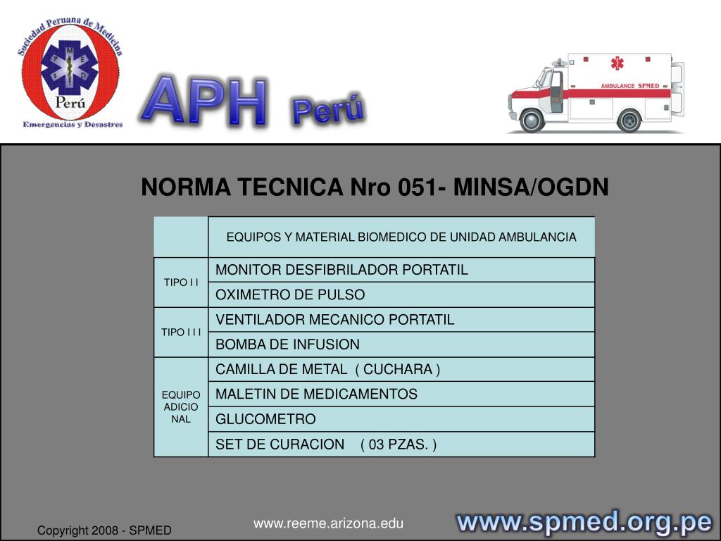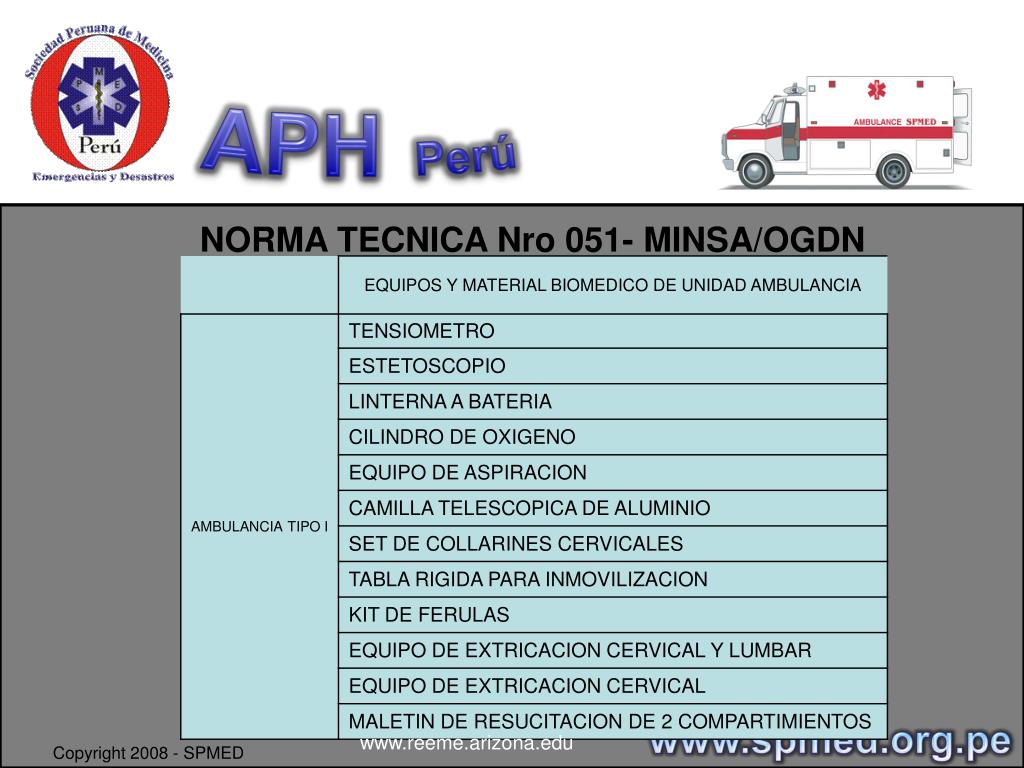 APHPerú NORMA TECNICA Nro 051- MINSA/OGDN • Mejorar la calidad de transporte asistido público y no público de pacientes por vía terrestre a nivel nacional. • Objetivo de establecer los estándares mínimos para regular el transporte asistido de pacientes por vía terrestre. www.spmed.org.pe www.reeme.arizona.edu Copyright 2008 - SPMED