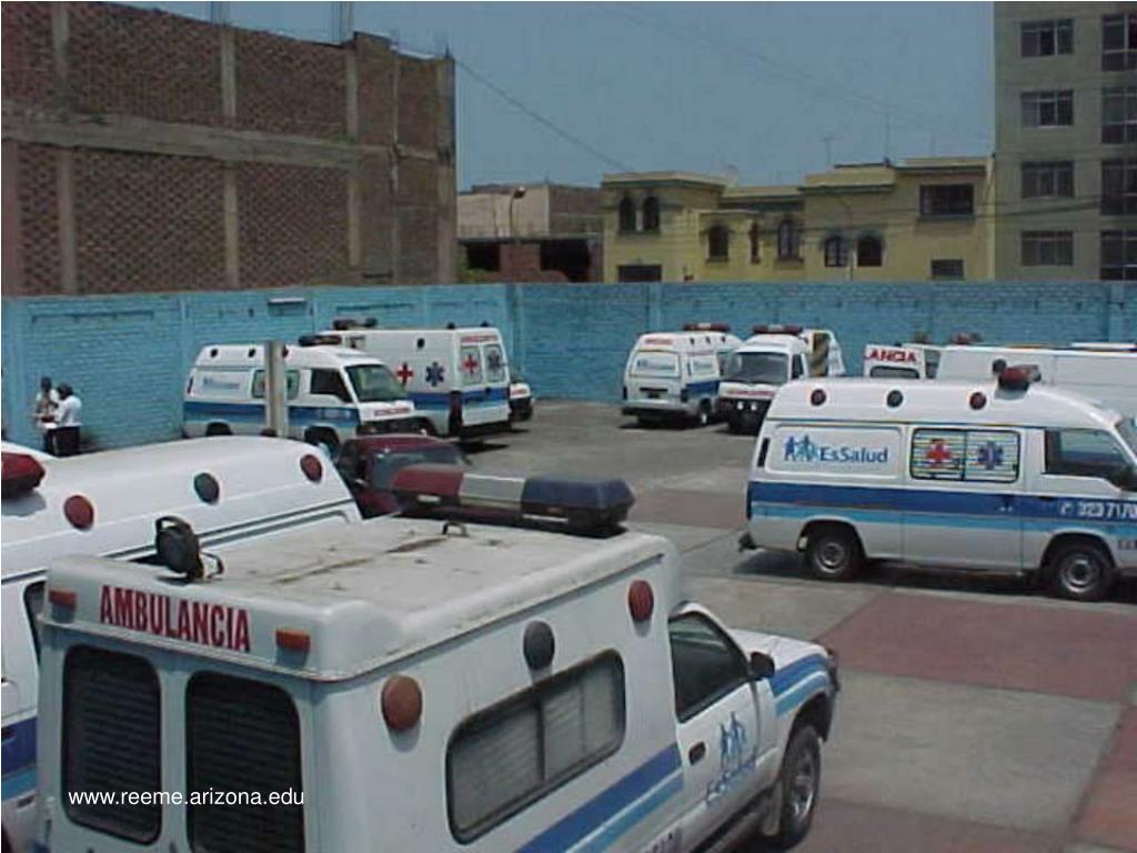 APHPerú TIEMPO DE RESPUESTA DE UNA AMBULANCIA RESPUESTA. 4 – 6 MINUTOS ( 1 AMB. X 50,000 HAB. ) SITUACIONES DE DESASTRE ( 3 AMB. X 50,000 HAB. ) COSTO ANUAL DE OPERATIVIDAD x 24 HRS/AÑO $ 250,000 dólares anuales www.spmed.org.pe www.reeme.arizona.edu Copyright 2008 - SPMED