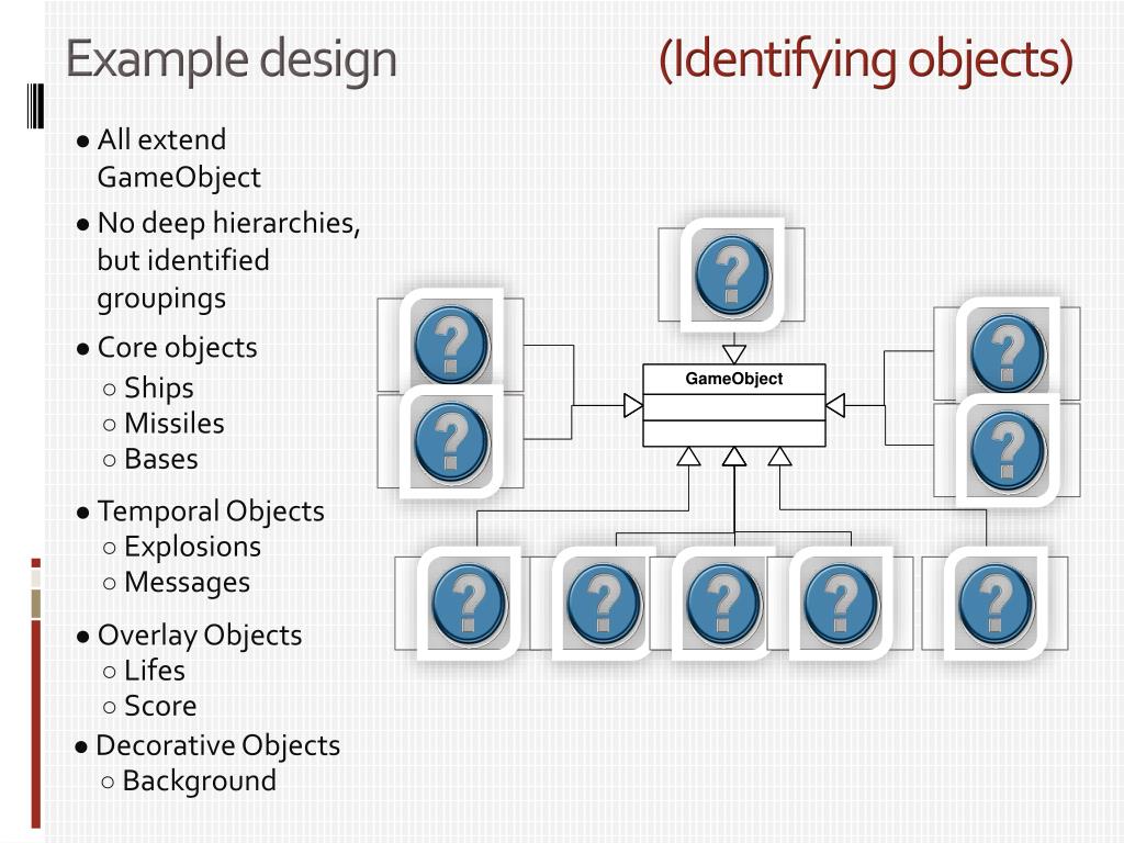 Example design (Identifying objects) ● All extend GameObject ● No deep hierarchies, but identified groupings ● Core objects ○ Ships ○ Missiles ○ Bases ● Temporal Objects ○ Explosions ○ Messages ● Overlay Objects ○ Lifes ○ Score ● Decorative Objects ○ Background
