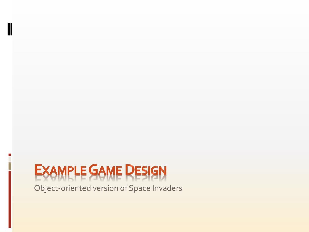 Space Invaders… Let us consider one possible design of a classic computer game – Space Invaders. Warning: This is better classified as a final-pass reverse engineered design – i.e. we have a clear understanding of the target game and the final ‘solution’ is presented. The normal design process is often highly iterative and exploratory.