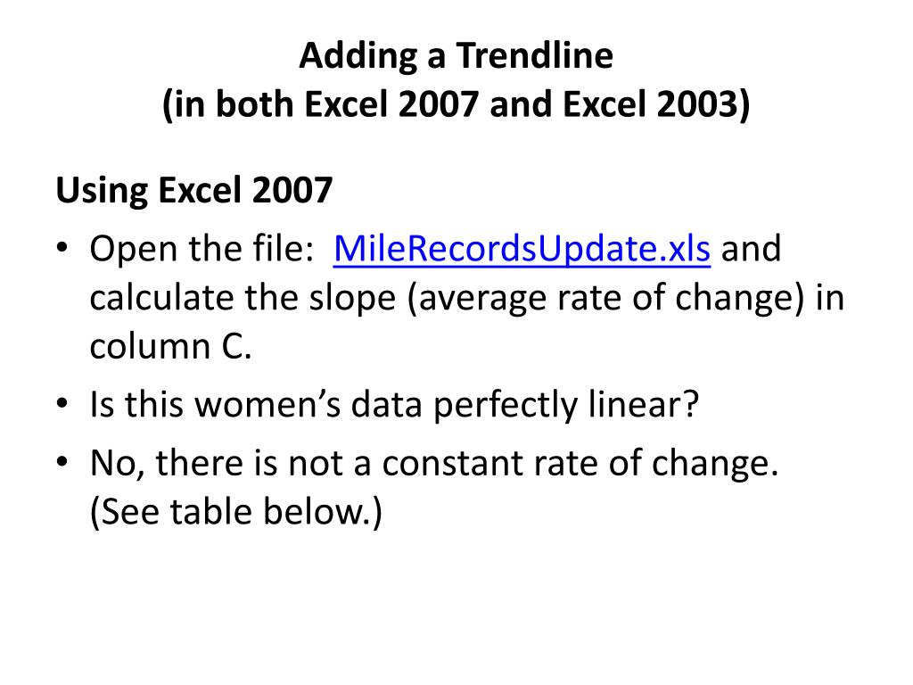 Adding a Trendline(in both Excel 2007 and Excel 2003) Using Excel 2007 • Open the file: MileRecordsUpdate.xls and calculate the slope (average rate of change) in column C. • Is this women’s data perfectly linear? • No, there is not a constant rate of change. (See table below.)