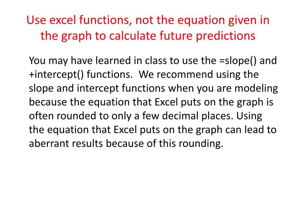 Use excel functions, not the equation given in the graph to calculate future predictions You may have learned in class to use the =slope() and +intercept() functions. We recommend using the slope and intercept functions when you are modeling because the equation that Excel puts on the graph is often rounded to only a few decimal places. Using the equation that Excel puts on the graph can lead to aberrant results because of this rounding.