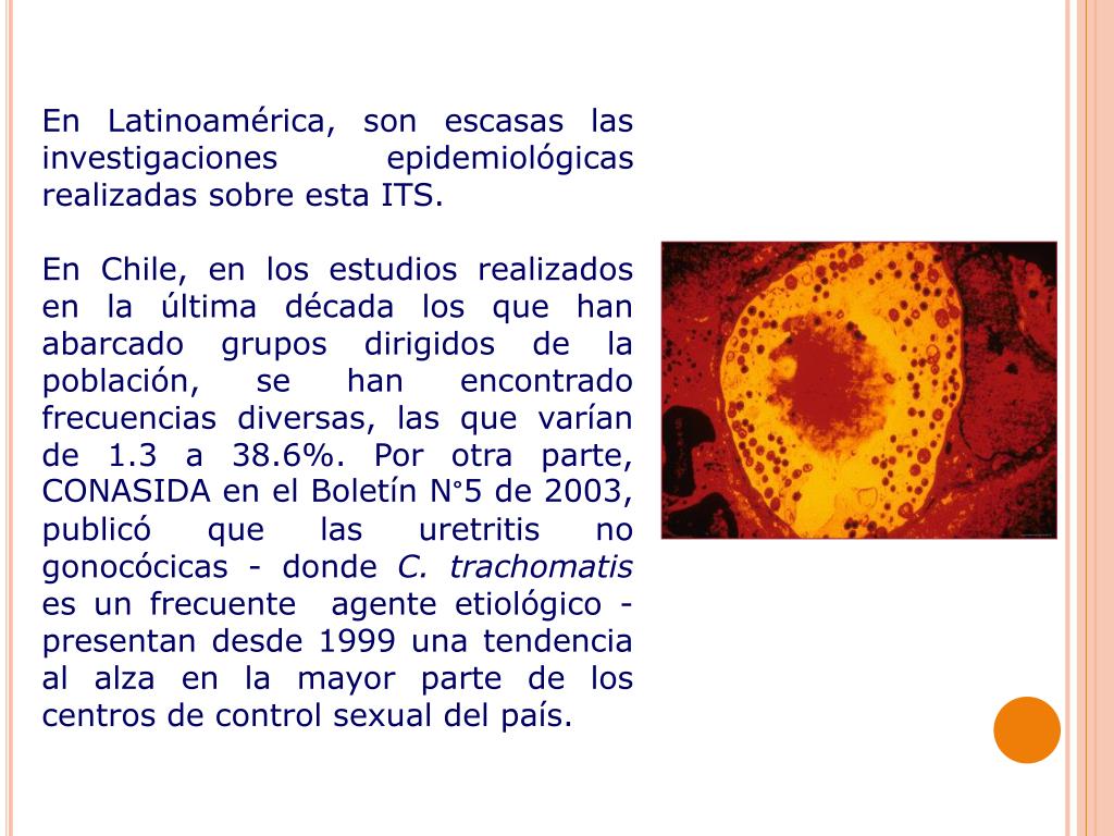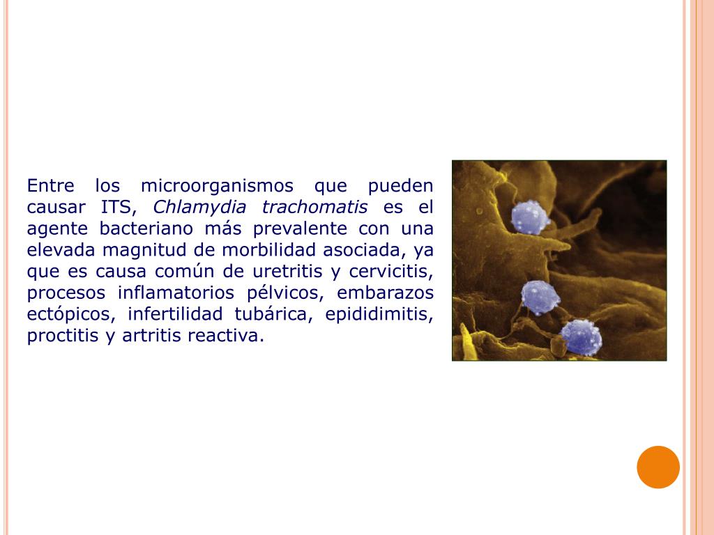 Entre los microorganismos que pueden causar ITS, Chlamydia trachomatis es el agente bacteriano más prevalente con una elevada magnitud de morbilidad asociada, ya que es causa común de uretritis y cervicitis, procesos inflamatorios pélvicos, embarazos ectópicos, infertilidad tubárica, epididimitis, proctitis y artritis reactiva.