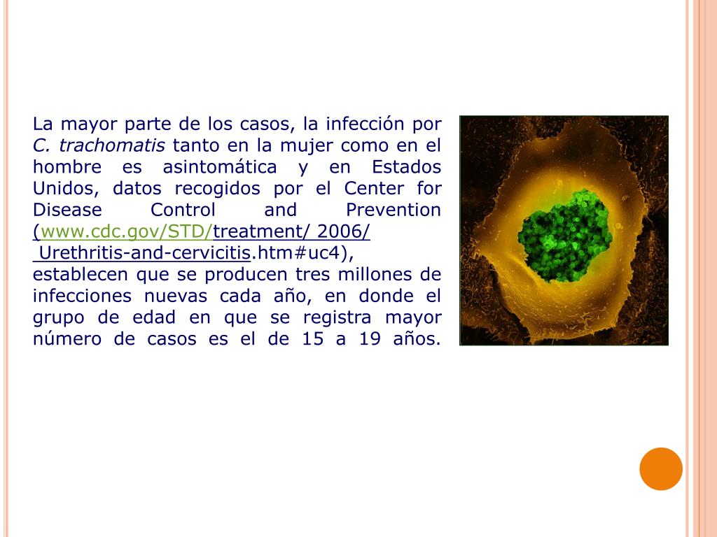 La mayor parte de los casos, la infección por C. trachomatis tanto en la mujer como en el hombre es asintomática y en Estados Unidos, datos recogidos por el Center for Disease Control and Prevention (www.cdc.gov/STD/treatment/ 2006/ Urethritis-and-cervicitis.htm#uc4), establecen que se producen tres millones de infecciones nuevas cada año, en donde el grupo de edad en que se registra mayor número de casos es el de 15 a 19 años.