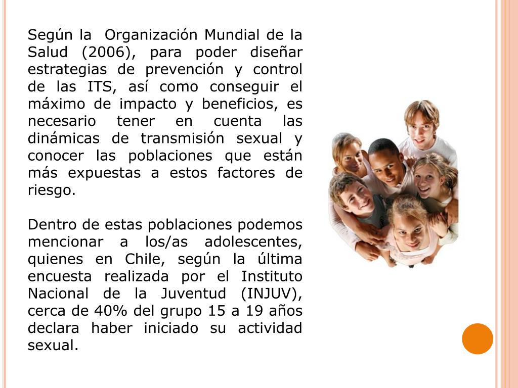 Según la Organización Mundial de la Salud (2006), para poder diseñar estrategias de prevención y control de las ITS, así como conseguir el máximo de impacto y beneficios, es necesario tener en cuenta las dinámicas de transmisión sexual y conocer las poblaciones que están más expuestas a estos factores de riesgo. Dentro de estas poblaciones podemos mencionar a los/as adolescentes, quienes en Chile, según la última encuesta realizada por el Instituto Nacional de la Juventud (INJUV), cerca de 40% del grupo 15 a 19 años declara haber iniciado su actividad sexual.
