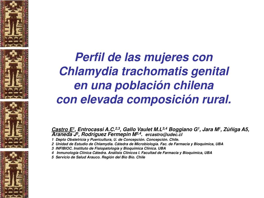 Perfil de las mujeres con Chlamydia trachomatis genital en una población chilena con elevada composición rural. Castro E1, Entrocassi A.C.2,3, Gallo Vaulet M.L3,4 Boggiano G1, Jara M1, Zúñiga A5, Araneda J5, Rodríguez Fermepin M3,4. ercastro@udec.cl 1 Depto Obstetricia y Puericultura, U. de Concepción. Concepción. Chile. 2 Unidad de Estudio de Chlamydia. Cátedra de Microbiología. Fac. de Farmacia y Bioquímica, UBA 3 INFIBIOC. Instituto de Fisiopatología y Bioquímica Clínica. UBA 4 Inmunología Clínica Cátedra. Análisis Clínicos I. Facultad de Farmacia y Bioquímica, UBA 5 Servicio de Salud Arauco. Región del Bio Bío. Chile